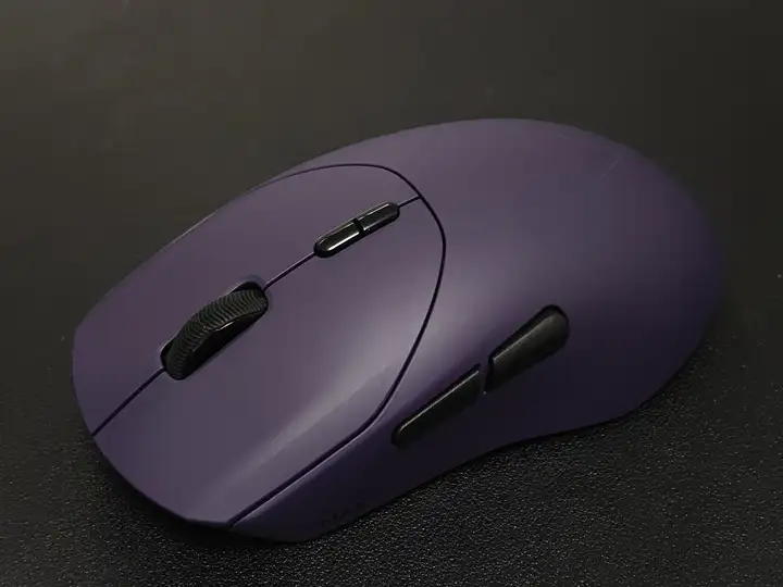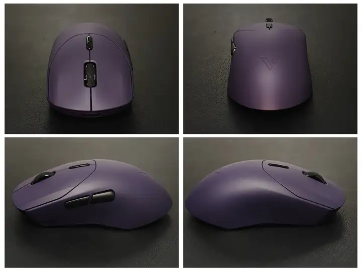 VT9 MAX游戏鼠标采用左右对称设计,MAX版在左侧裙下方印有MAX字样,非常大气。鼠标左侧裙设有两枚类肤处理的侧键,触感很棒;两侧裙前端腰线内收,让手指更易抓握;饱满的尾部,对手掌的支撑性更好;