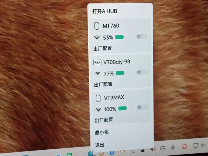 日常使用时,还可以通过任务栏右下角的A-hub图标快速查看键鼠电量,非常方便 ;