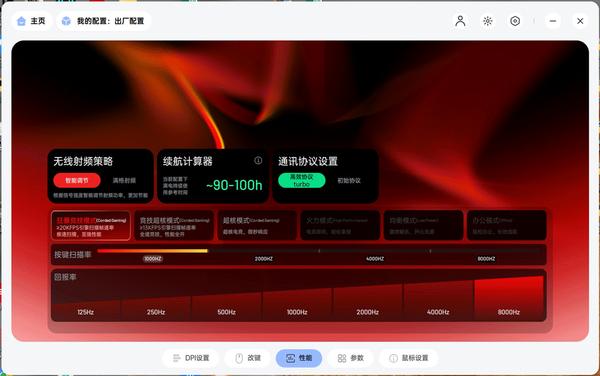 在性能设置界面中大家可以针对自身需求,设定适合不同场景的无线射频策略和引擎模式,主要包含:狂暴竞技模式、竞技超核模式、超核模式、火力模式、均衡模式和办公模式。VT1 MAX版拥有目前行业最强的竞技固件,开启狂暴竞技模式后,固定疾速扫描帧率可以≥20KFPS,再搭配8K回报率,性能拉满。