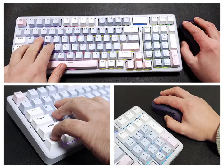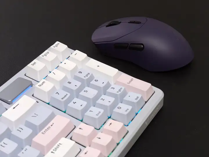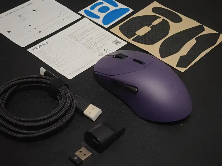 键盘包装内包括:键盘本体、2.4G接收器、防尘盖、说明书、拔键/轴器,数据线,USB A-C转接头和四颗备用轴体;鼠标包装内包括:鼠标本体、2.4G接收器、数据线、USB A-C转接头、一套PTFE特氟龙鼠标脚垫、一套按键防滑贴、说明书和质保卡。