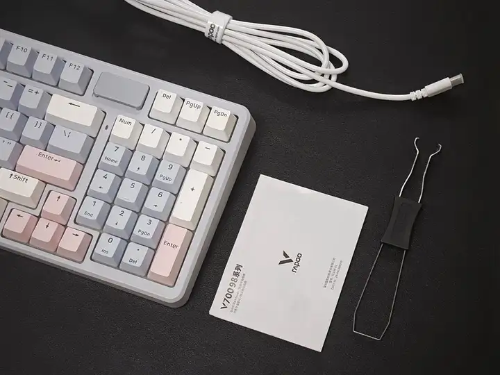 雷柏V700DIY-98三模机械键盘采用广受欢迎的紧凑型98%配列布局,拥有数字键区和下沉式方向键,数字键区上方保留了Del删除键和上下翻页键,游戏和办公场景都很适用。键盘尺寸为388*143*42mm(长*宽*高),采用高含量PBT材质的双色注塑键帽,美观大方的闭合字符,兼具防滑耐打油的特性,在游戏竞技中不易打滑;键盘轴体搭载了雷柏自研5000万次寿命的凯华定制快银轴,触发行程仅1.2±4mm并且支持全键热插拔和全键无冲;