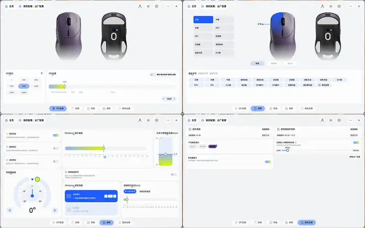 驱动导航栏包括:DPI设置、改键、性能、参数和鼠标设置。其中DPI可设7档,并支持启用横向X轴与纵向Y轴独立设置DPI数值;改键可以设置10个可编辑按键,像常用的火力键、狙击键、系统功能、宏和组合键都可以绑定在玩家需要的按键上;参数设置中包含的选项丰富而专业。不仅可以开启移动同步、直线修正、波纹修正,还可以设置休眠等待时间、LOD高度、回报率(最高8KHz)和传感器角度等功能。使用玻璃垫的朋友,开启玻璃追踪技术后,鼠标移动起来丝毫不影响稳定性;还可以根据自己的习惯调整按键防抖延迟功能,非常人性化;