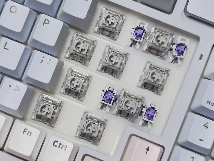 雷柏V700DIY-98三模机械键盘的大键采用下灯位和卫星轴设计,出厂预润,上手即用,搭配开槽PC定位板和开槽PCB,按起来非常顺畅;这款键盘支持全键热插拔,全键搭载5000万次寿命的凯华定制快银轴和凯华五脚热插拔轴座,玩家可以DIY成自己喜爱的轴体;  凯华定制快银轴采用线性结构,手感通透触底,非常适合FPS游戏玩家使用。这款轴体的触发压力为:35±10gf,触发行程为:1.2±0.4mm,触底行程为:3.4±0.4mm 回弹灵敏,轴心按起来也很稳,搭配半透明PC上盖,透光表现很好。