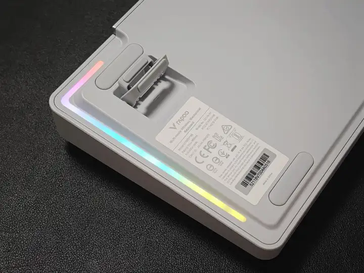 键盘底部底部设有4枚椭圆形防滑垫以及一对脚撑;两侧RGB氛围灯带,支持单色、呼吸和RGB流光3种灯效,非常酷炫。