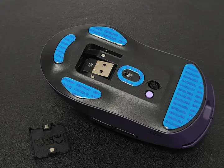 鼠标底部采用四枚特氟龙脚贴,操控更顺滑。(使用前记得撕掉蓝色保护膜)。光学透镜上方设有电源开关和紫色DIY键(默认可切换鼠标7档性能配置,可通过驱动自定义其他功能),下方的磁吸收纳仓不仅可以收纳2.4G无线接收器,