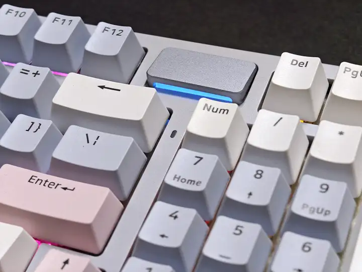 键盘右上方还加入了极具设计感的时空幻境仓,磁吸仓盖采用铝合金材质。其下还有一枚数字键区指示灯;