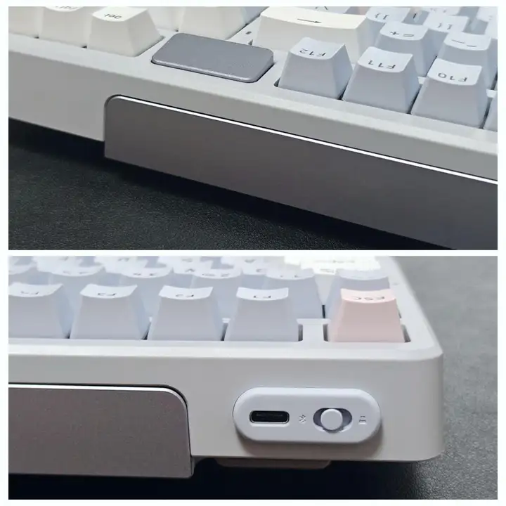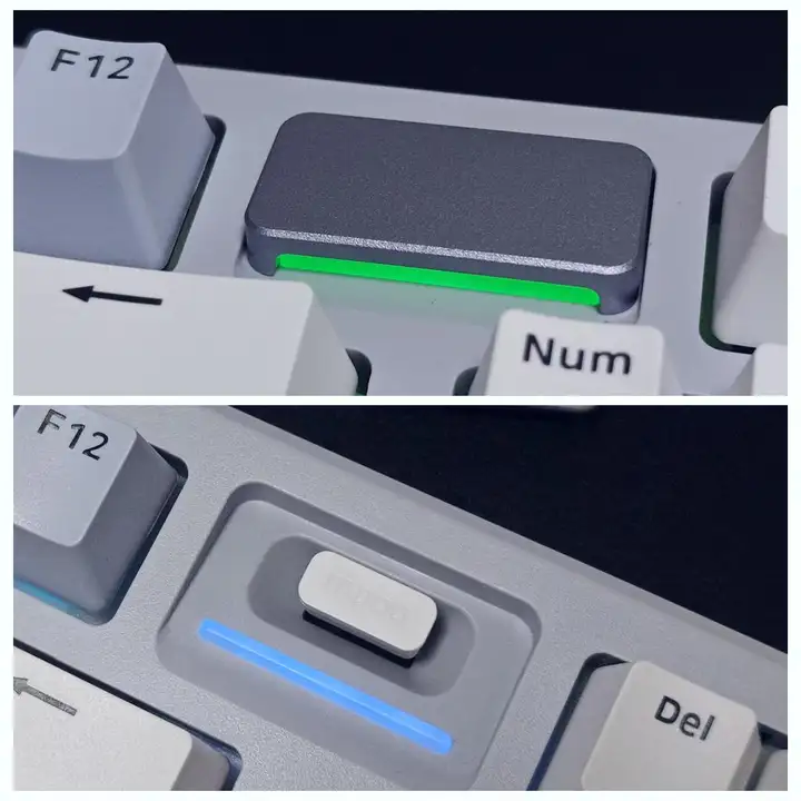 时空幻境仓盖下磁吸收纳了一个2.4G无线接收器和一个RGB指示灯,该指示灯支持颜色和和亮度调节, 日常既可以作为装饰,又可以作为充电指示灯,充电时能通过颜色变化表示键盘剩余电量)  键盘后侧也安置了一块银色铝合金铝装饰条,与时空幻境仓交相呼应,更好地提升了键盘质感;