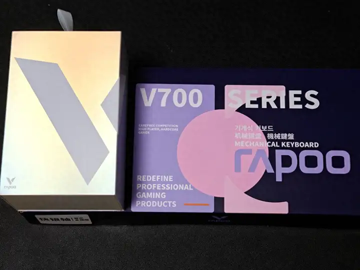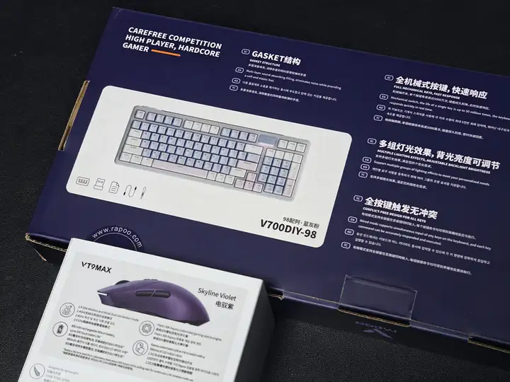 雷柏V700DIY-98机械键盘采用深蓝、紫、粉配色的纸盒包装,而VT9MAX采用了二代系列特有的银色镭射包装,在不同角度的光线照射下会呈现炫酷的彩光。