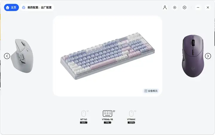 这套键鼠套装采用统一的雷柏自研A-Hub驱动,这是国产第一个做到同时兼容 windows平台/macOS平台/网页驱动(https://hub.rapoo.cn/)三平台,可以实现键鼠的深度个性化联动设置,并能提供配置文件跟随应用切换功能,后续雷柏的新品都将接入其中。这款驱动界面简洁易用,支持多设备管理,在有线和2.4G无线模式下均可使用。驱动主页可以实时看到设备剩余电量%、充电状态以及设备概况。