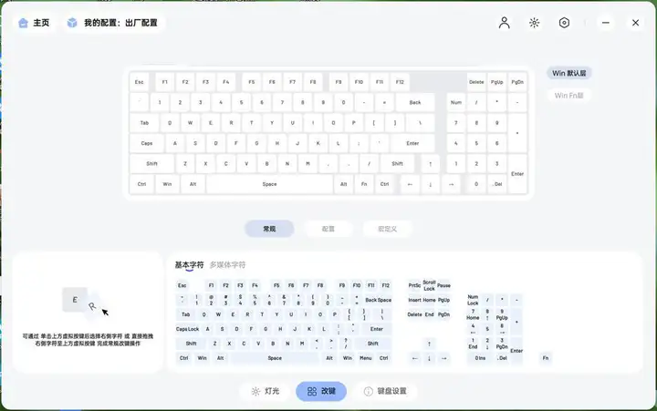 驱动页面包括:灯光、改键、宏定义和键盘设置。改键设置中全键均可自定义基本和多媒体字符以及宏自定义,并且支持Win FN层设置和四个配置,配置文件会自动跟随,随软件进行切换,无论是在家中还是网吧中使用都可以云同步成熟悉的按键配置,非常方便;