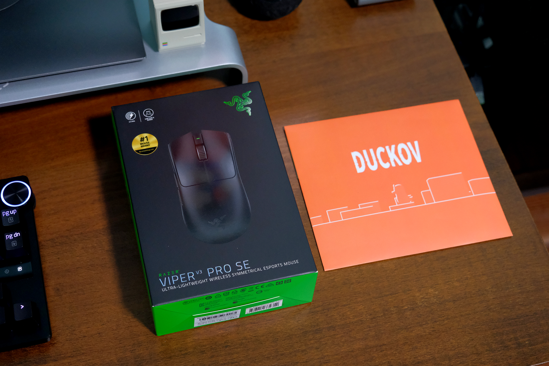 最近雷蛇毒蝰V3专业版新推出了SE版本,同时还有鸭科夫限定版,在外观方面依然与V3专业版一致,延续了毒蝰平缓高背的顶级手感,不同之处在于限定版加赠了“逃离鸭科夫”防滑贴,价格上也仅仅在官方售价上加了一份普通鼠标防滑贴的价格,性能方面SE版保持最高35000DPI,750IDS加速,70G加速度,只是在轮询率方面由之前8000Hz降为了1000Hz,就日常游戏来说差别并不会太大,而售价也更友好,当然如果是追求极致性能或显示器是180Hz以上超高刷还是建议一步到位选择8000Hz轮询率性能。 接下来就跟着楼主更细致的了解一下这款鸭科夫限定版的SE吧~ 简单开箱 拿到包装盒的第一时间就能感受到蛇家经典的绿黑配色风格,正面是可以看到鼠标的彩图展示,下方还标注了V3 PRO SE的字样,另外随包装还附赠了“逃离鸭科夫”限定防滑贴▼