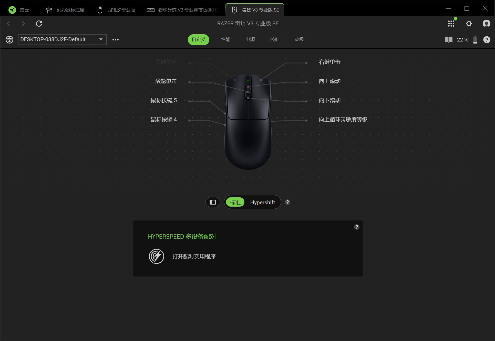 雷云4驱动界面显示简洁,进入到鼠标界面后玩家可以根据个人的使用习惯对按键进行自定义设定,另外HYPERSPEED接收器还支持多设备配对▼
