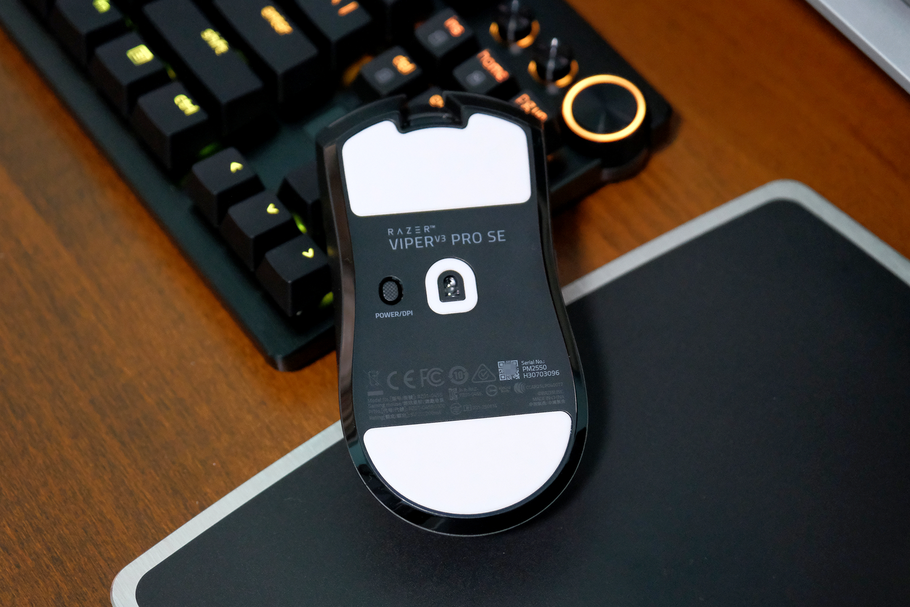 鼠标底部也与专业版保持一致,采用中置传感器设计,上下采用大面积脚贴,在玩家游戏竞技快速移动时能够保持顺滑稳定,传感器旁边则是PDI调节/电源一体式设计的功能按键▼