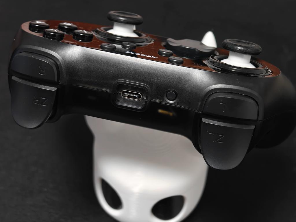 手柄顶部设有配件键、Type-C充电口、一对肩键(L&R)和一对扳机(ZL&ZR)。沉浸式高精度设计的扳机,可以给玩家带来沉浸式的物理触感,最高可提供约2.5N的真实反馈力,并具备15°弧度的人体工学设计,让每一次操作都带来沉浸式的物理触感。