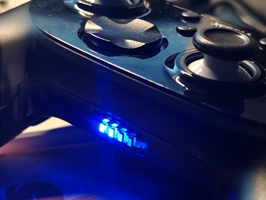 手柄内置600mAh锂电,通过Type-C口充电时,下方的四盏蓝色指示灯会依次亮起显示充电进度,非常方便;
