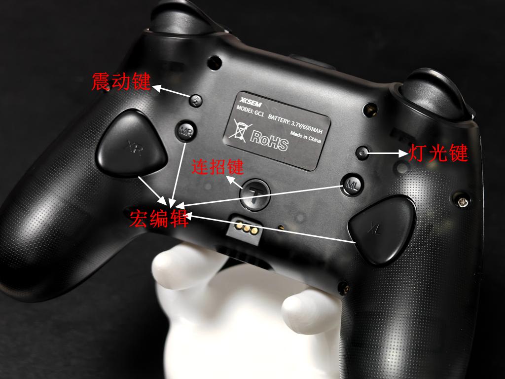 手柄背面XL和XR两枚宏键,可以让玩家录制宏、映射连招,游戏中使用更方便。其他功能键可以让玩家更直接的控制震动强弱和灯效以及编辑连招。两侧握把处还加入了防滑纹理,可以让玩家在激烈的游戏中稳稳地握住手柄、不易松脱;