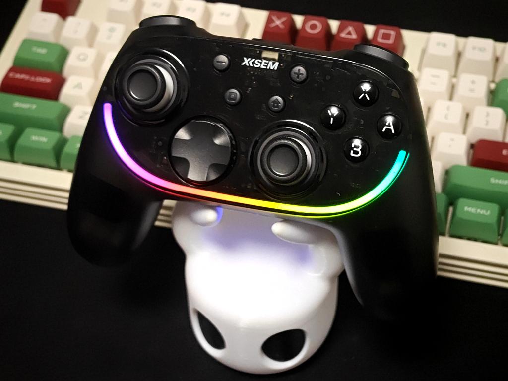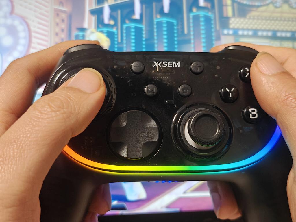 西圣GC1游戏手柄采用经典的Switch手柄按键布局,YXBA按键排列+双霍尔摇杆+8向十字键,搭配半透明幻雾晶透机身和RGB灯带,科技感和电竞氛围十足,摇杆四周加入了POM耐磨环,长期使用不会掉粉。西圣LOGO四周分布着“-”号键“+”号键“截图键”和“home键”