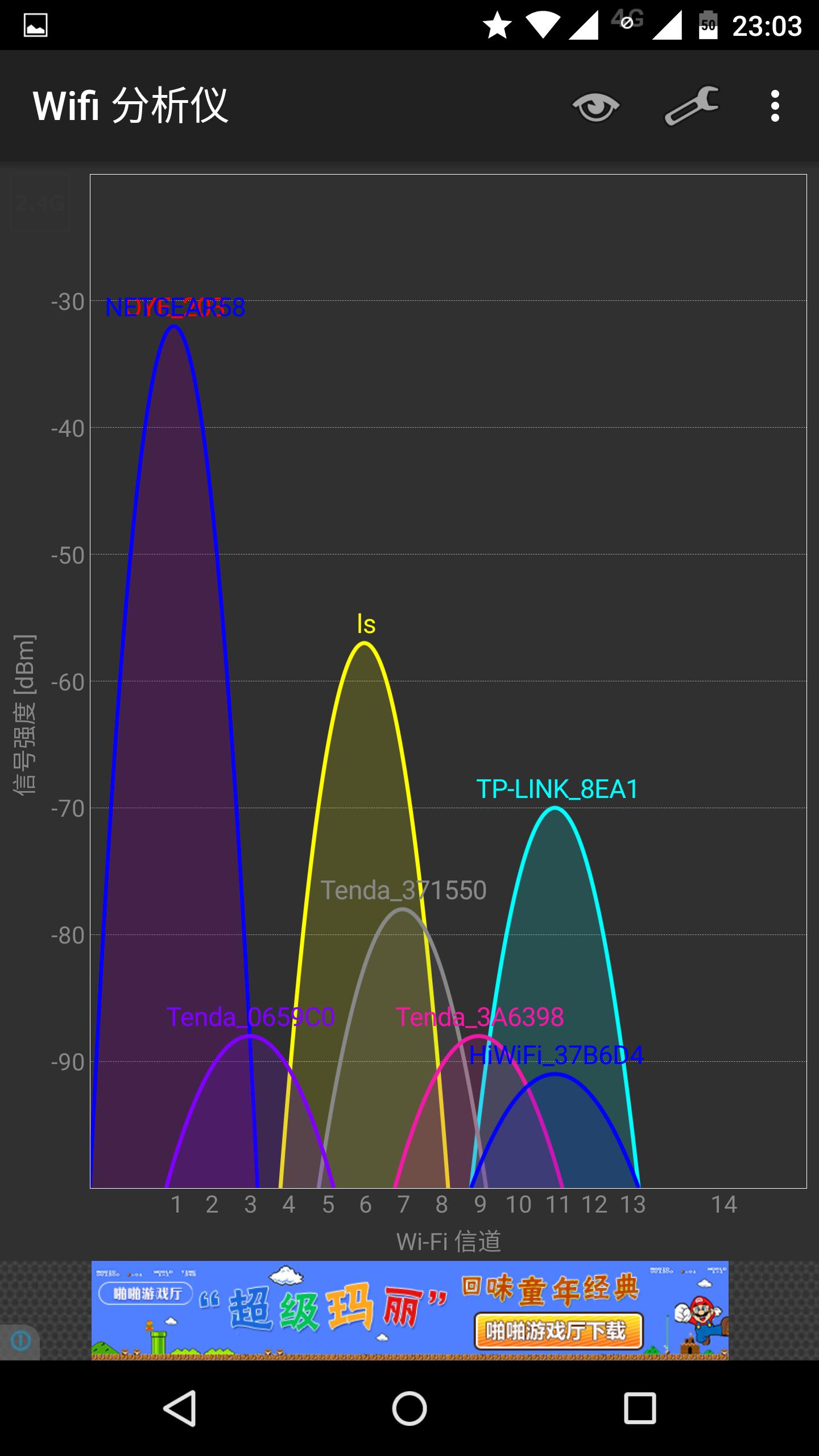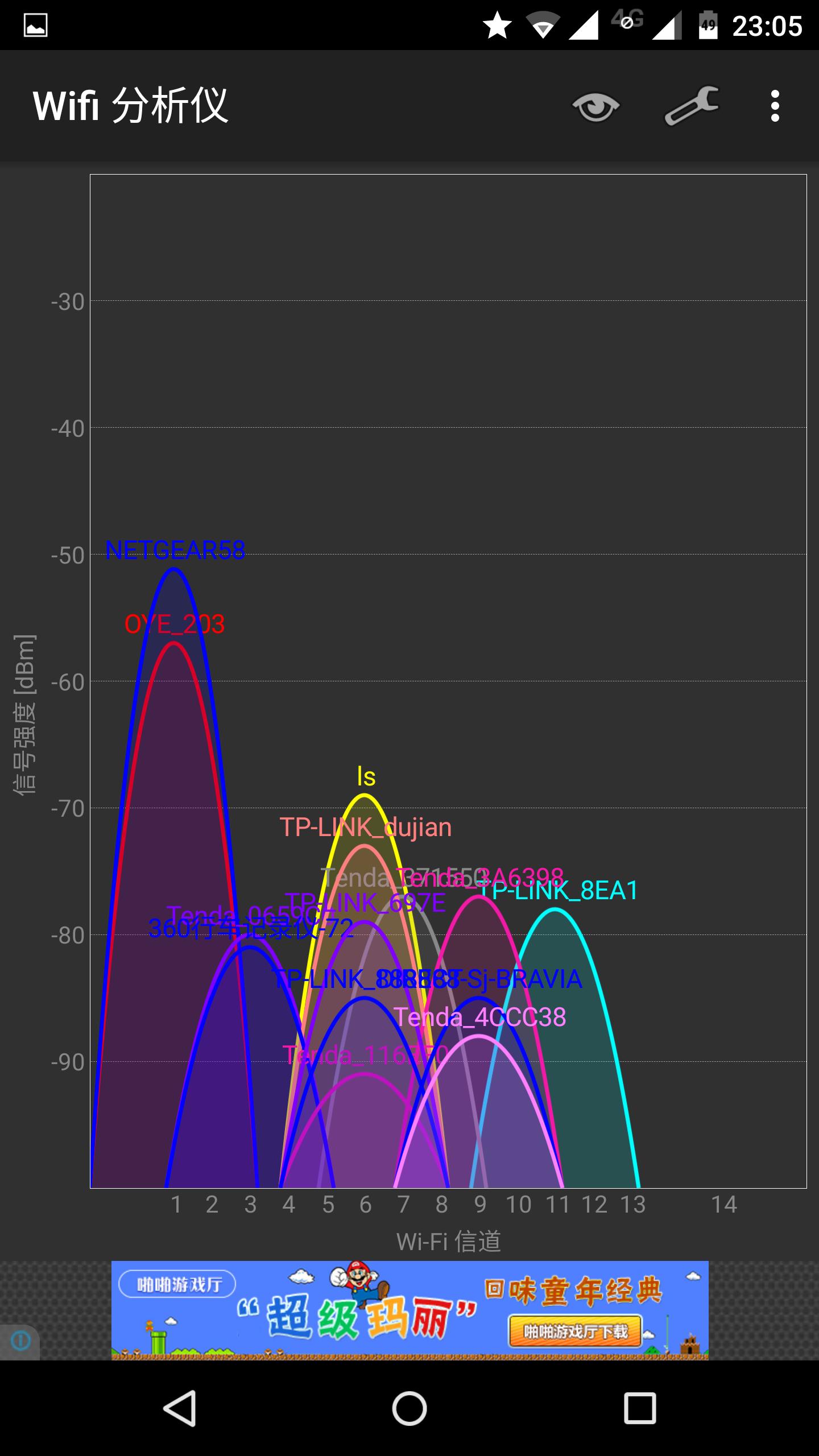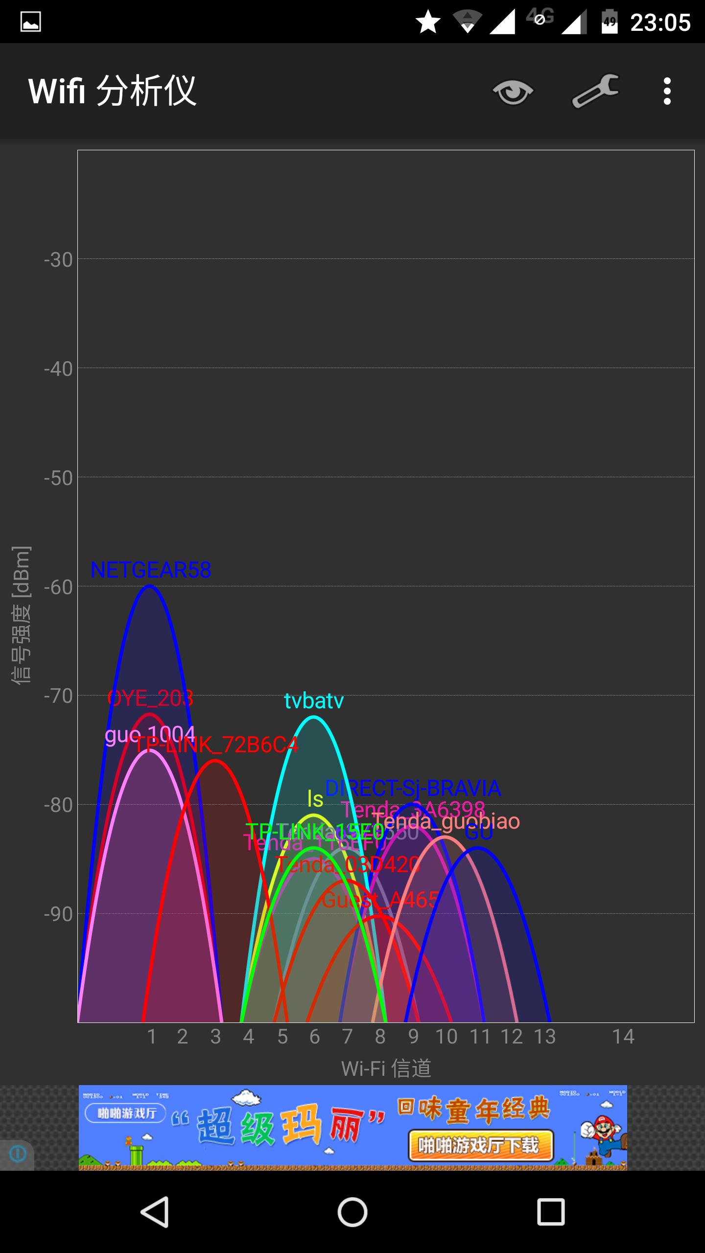 4、信号强度 ARLO套件中的基站本质是一台无线路由器,系统完成安装后,在搜索到一个名为NETGEAR58测试NEGGEAR58路由器的WIFI信号强度。家中户型为100平方米的两室两厅结构,大致结构图如下: 其中A处为路由器位置,A、B、、D、E、F为室内测试位置。A、B、C、D、E、F处的信号强度依次如下图。