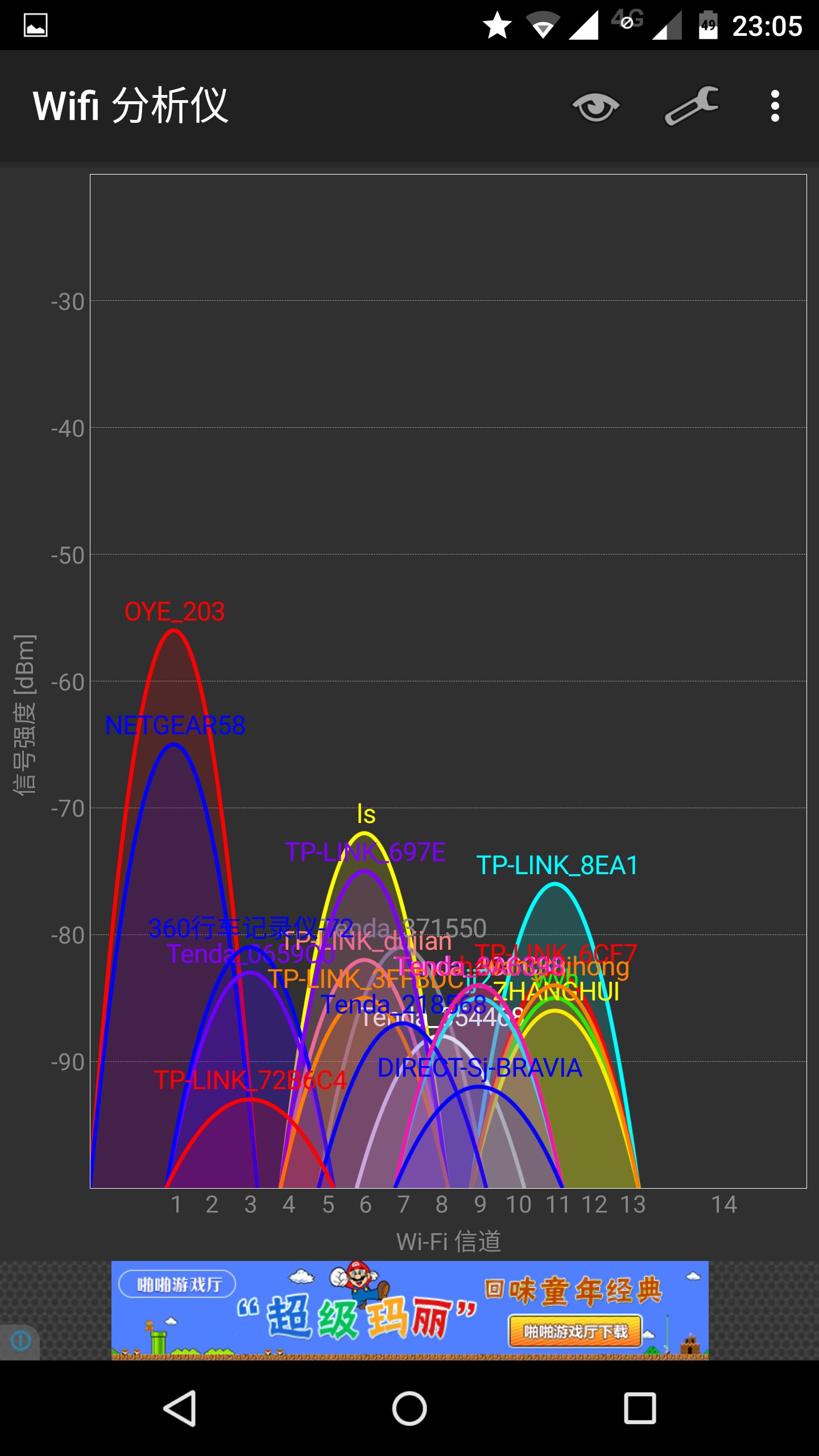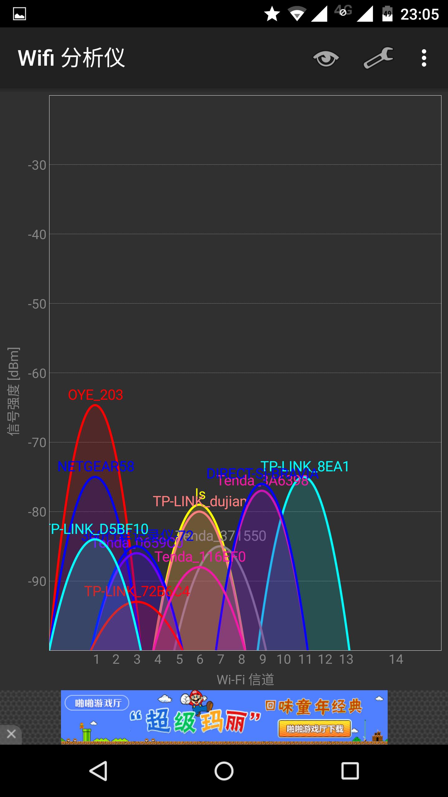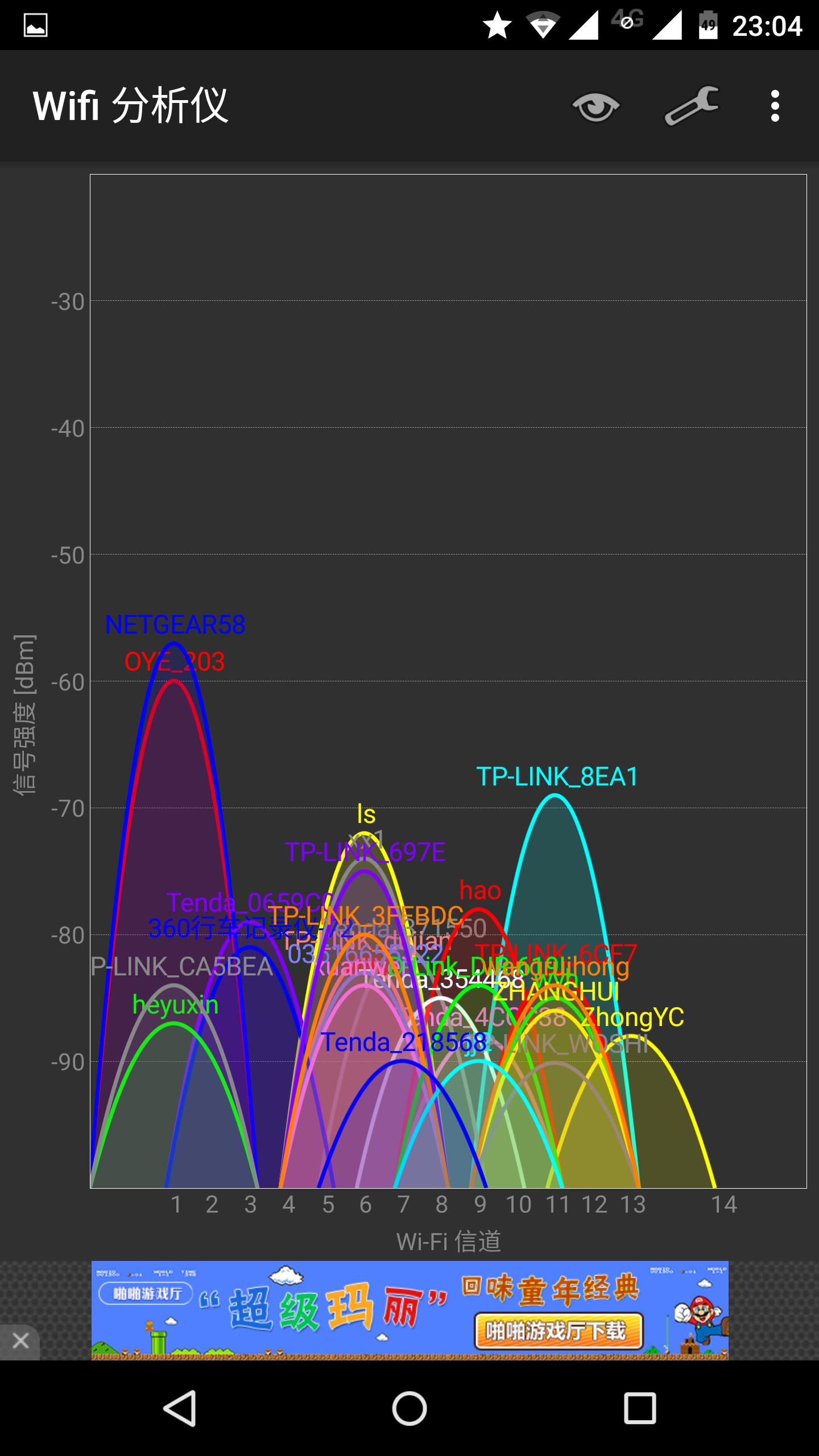 4、信号强度 ARLO套件中的基站本质是一台无线路由器,系统完成安装后,在搜索到一个名为NETGEAR58测试NEGGEAR58路由器的WIFI信号强度。家中户型为100平方米的两室两厅结构,大致结构图如下: 其中A处为路由器位置,A、B、、D、E、F为室内测试位置。A、B、C、D、E、F处的信号强度依次如下图。