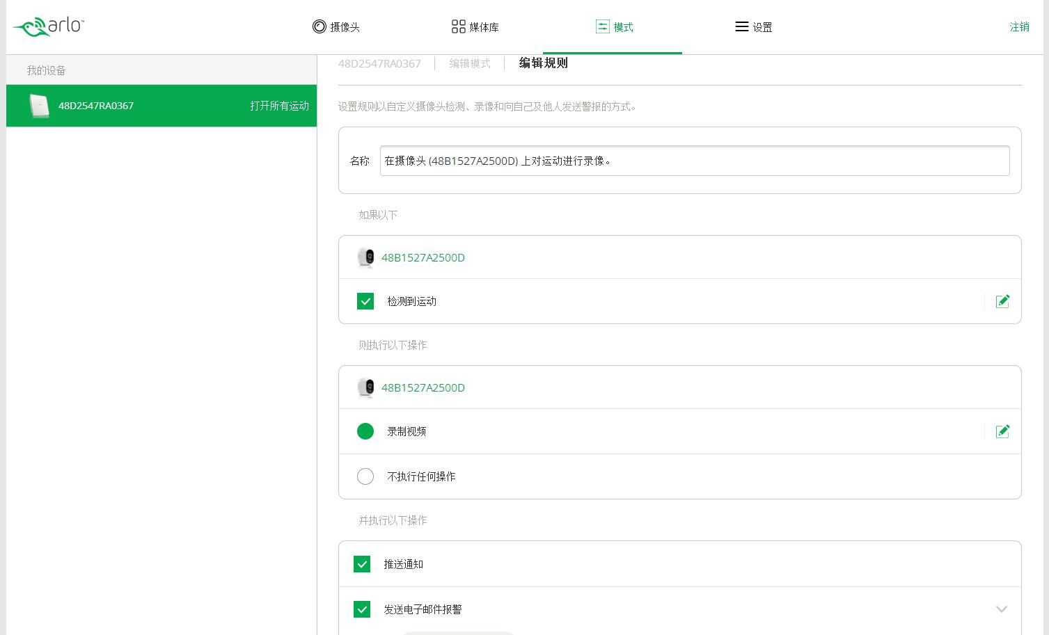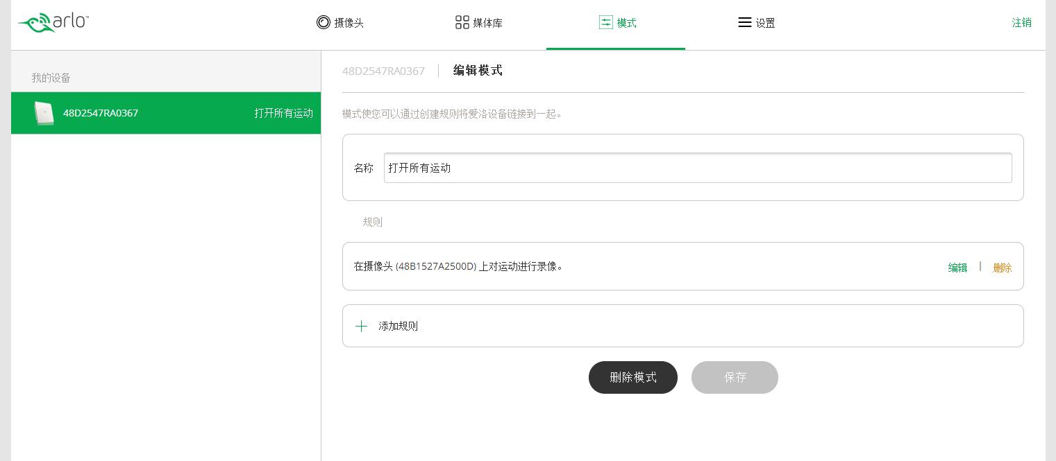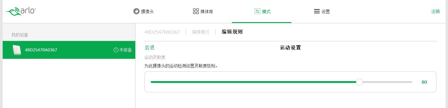 3、运动捕捉功能 支持运动捕捉功能应该说是ARLO智能高清双摄像头家庭监控系统最大的卖点。顾名思义,运动捕捉就是只有摄像头检测到物体运动时,才会打开录制功能,如果画面是静止的,摄像头就不会录制监控内容,以节省电量和云盘空间。 在模式里面,打开运动模式 检测到运动,黄色LED会亮起,闪烁。 编辑规则,在规则中可以看到,摄像头的运动检测设置灵敏度级别、执行操作内容等。